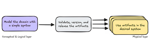 S2DM provides a way to address this by defining common concepts once and selectively translating them into artifacts that can be applied across systems. These artifacts can be used to guide API definitions, database schemas, or other implementation layers. Let’s look at a simple example of how this can be applied end-to-end.